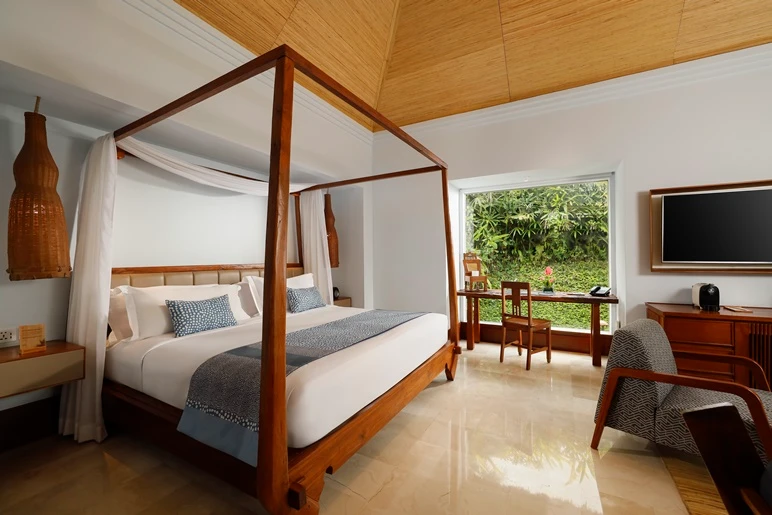 What makes Maya Ubud's villa feel truly alive is the soul embedded within its design. Every piece of furniture tells a story, drawn from Indonesia’s heritage and reimagined through thoughtful craftsmanship. Tables are shaped from reclaimed Javanese railway wood; walls are lined with uga timber once used to harness water buffaloes in the rice fields. Four-poster beds, conceived by architect Budiman Purnomo, rise from teak that once served as plough handles, while bamboo fish traps and tea-picker baskets now glow softly as lamps. Even the bathroom’s teakwood root stools are reborn from discarded timber, merging function with sculpture. Together, these elements speak of renewal and quiet reverence and serve as a reminder that beauty, when rooted in history, always feels effortless.