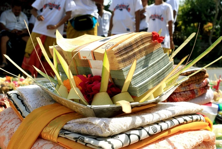 Once the prayers are completed each household prepares banten pengadegan which is placed at the front entrance of the family compound. This offering traditionally consists of rice eggs and pis bolong or kepeng coins. In past generations the ritual relied fully on these ancient coins but as times changed families began using rupiah notes and coins while preserving the ceremony’s original symbolism.