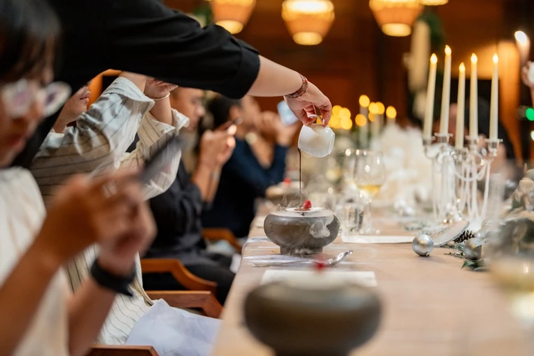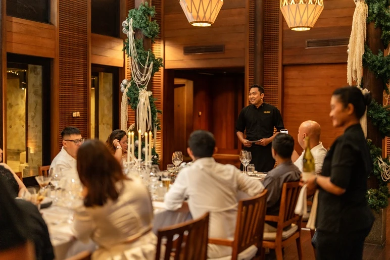Dessert concluded the dining experience with a distinctive interactive moment. Chef I Made Semawan returned to the front of the room carrying a dessert rack, demonstrating live how the Raspberry Hot Chocolate dessert was assembled. One completed dessert was presented directly to a nearby guest before the rest were served. Featuring Jungle Gold 65 percent dark chocolate, raspberry curd, pistachio crumble, orange meringue, Speculoos macaron, and vanilla gelato, the dessert was paired with the lively tune of Feliz Navidad, bringing energy and joy to the room.