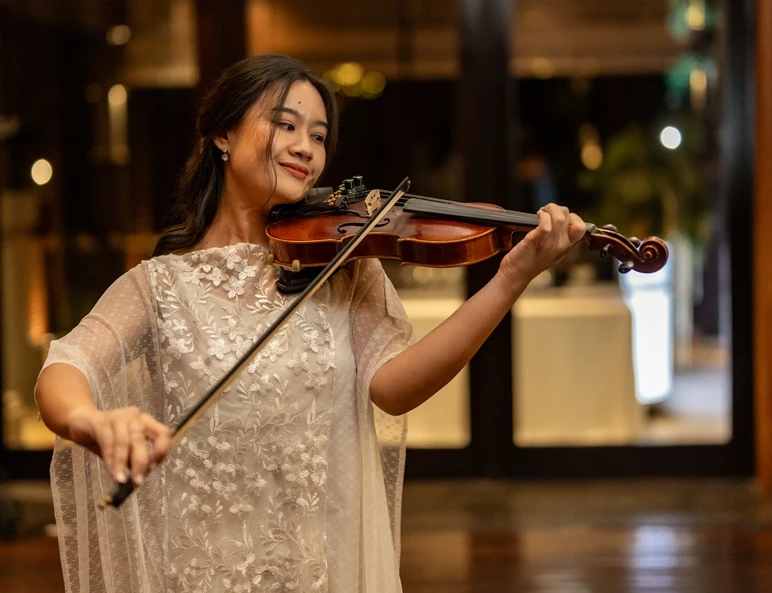 The violinist then led everyone out to the terrace, playing We Wish You a Merry Christmas as guests transitioned into the closing celebration. The night ended with relaxed mingling at the terrace bar, festive cocktails in hand, as guests danced lightly to live music under the tropical night sky.