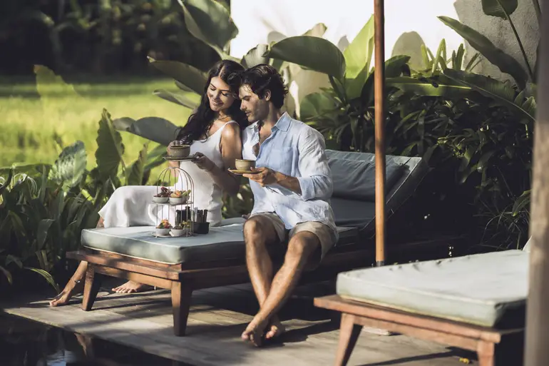 At Kaamala Resort & Spa Ubud, afternoon tea is an exclusive in-villa experience reserved for in-house guests. Served as part of a stay, particularly for those booking the Grand One Bedroom Villa with Private Pool, guests can enjoy their tea overlooking serene rice field views.