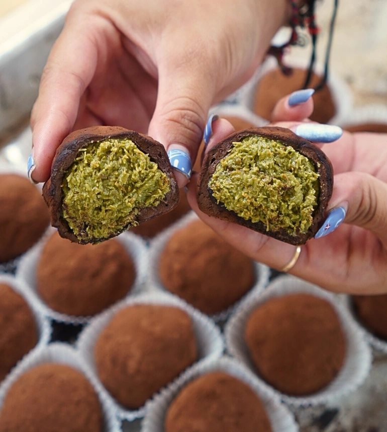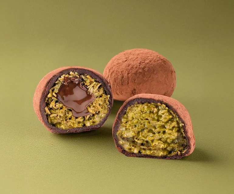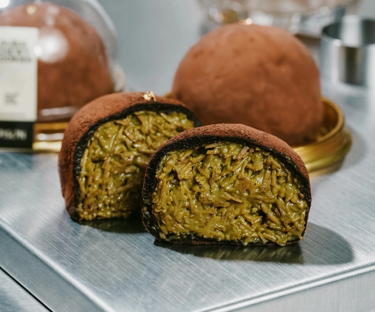 At first glance, you might think the chewy outer layer is made of mochi, especially with how it stretches when pulled apart. But the texture actually comes from a marshmallow coating. Inside, you’ll find a mix of kunafa and pistachio cream.