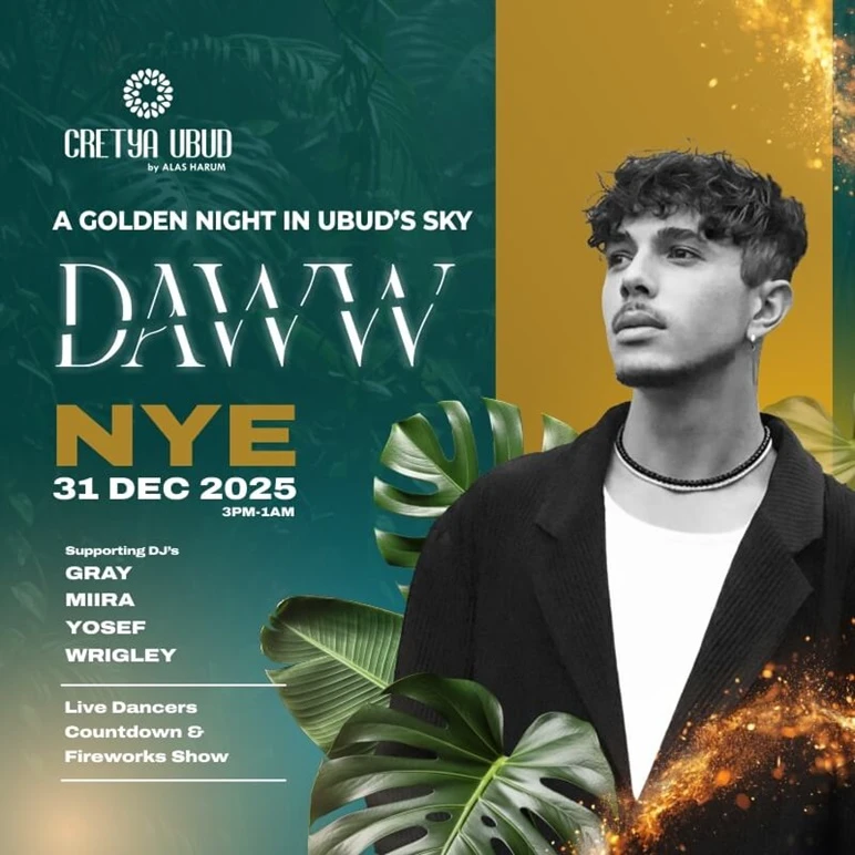 If you want NYE in the jungle instead of the coastline, Cretya Ubud brings something magical. DJ DAWW, also known as Maxime Lavine, guides the night through melodic house, African-inspired rhythms, and cinematic arrangements that feel tailor-made for Ubud’s lush surroundings. The atmosphere leans soulful and ethereal, perfect for guests who crave rhythm with emotional depth. Expect a night fueled by nature, music, and that unmistakable Ubud serenity meeting nightlife energy.