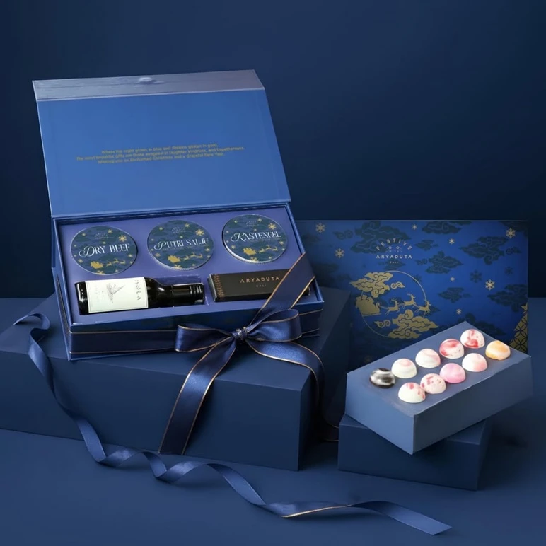 One of Kuta's favourite upscale hotels, Aryaduta presents a sophisticated Christmas hamper dressed in elegant blue. Inside, you will find festive staples like Putri Salju, Kastengel, and specially prepared Dry Beef, paired with a quality bottle of Isola wine and colorful bonbons. The hotel’s knack for refinement makes this hamper a polished choice for gifting clients, friends, or family.