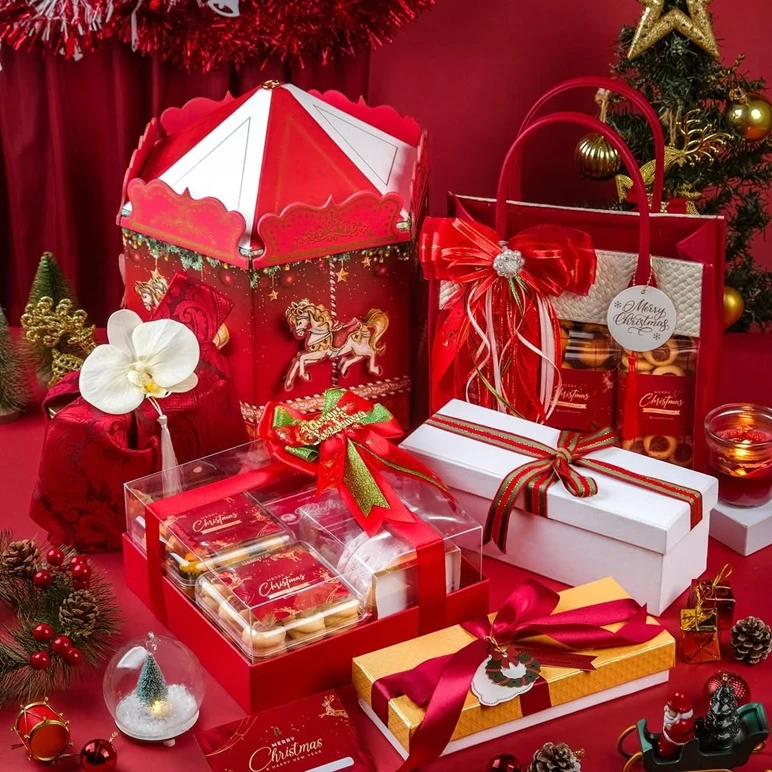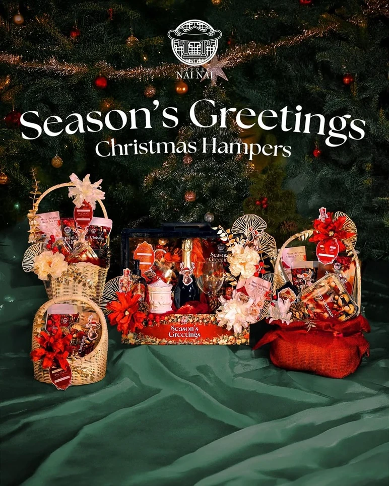 Dapoer Nai Nai delivers Christmas charm through refined presentations and warm, indulgent flavours. Their Season Greetings collection includes combinations of premium sparkling wine complete with a glass, rich chocolate loaf cakes, stylish rattan baskets filled with cookies, and other curated treats. Each set feels thoughtfully arranged for intimate celebrations with the people you treasure most.