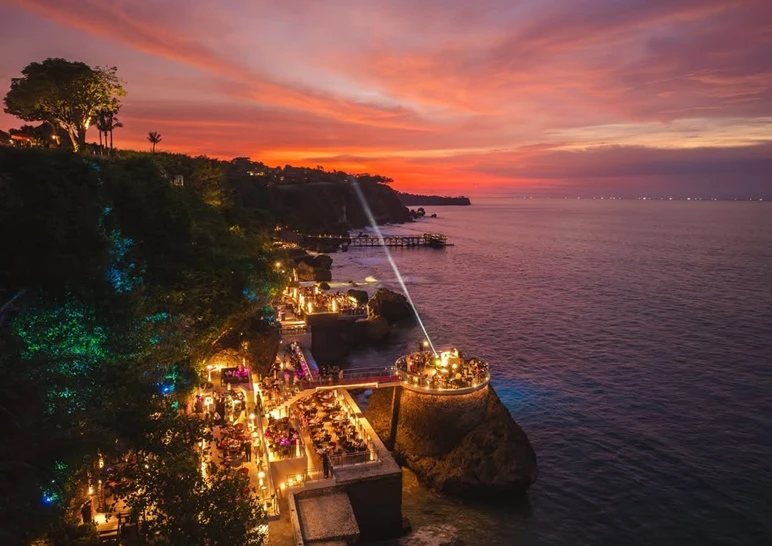 The legend that started it all still holds the crown for one of the most iconic cliffside venues. Rock Bar Bali is built directly onto natural rock formations along Jimbaran’s coast. Reached by a dramatic cliffside inclinator, it offers uninterrupted views of the sunset 14 meters above the ocean. With international DJs spinning from a booth carved into the cliff face, cocktails flowing, and an expansion that now hosts up to 650 guests, Rock Bar remains a must-visit for travelers chasing Bali’s nightlife magic.
