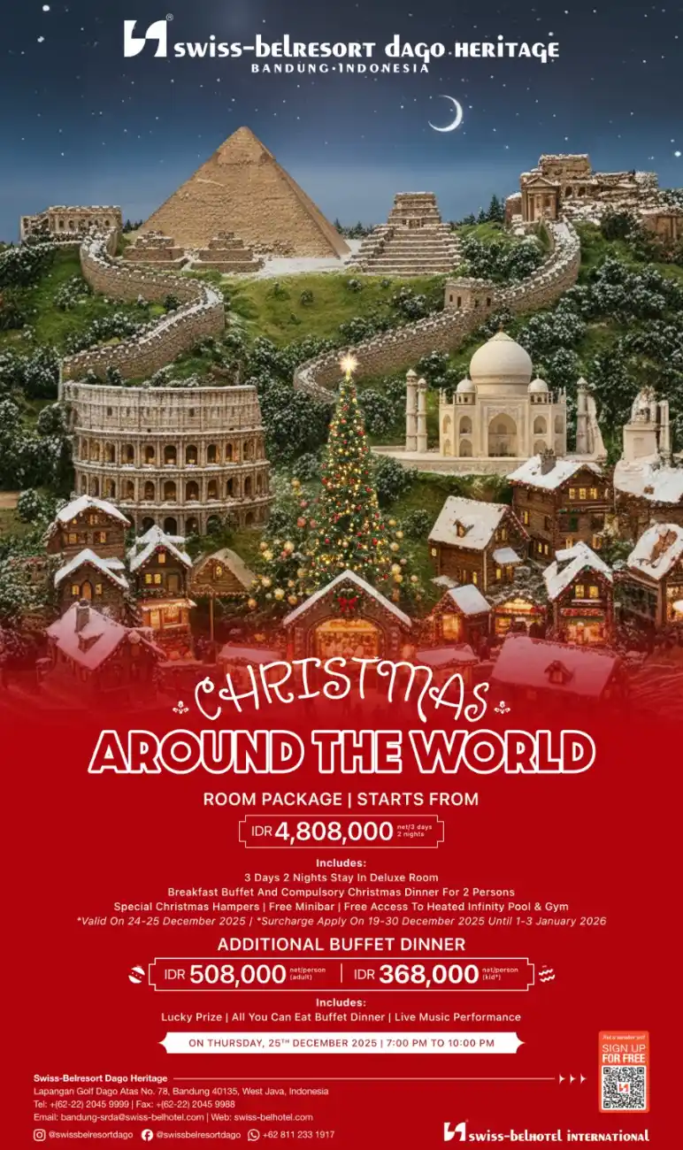 Rather than a typical dinner event, the night is crafted as an immersive, multi-genre celebration—one that encourages guests to dance, dine, and delight in the festive spirit. “With its lush surroundings, crisp air, and sweeping hillside views, Swiss-Belresort Dago Heritage Bandung has long been a favourite escape for travellers seeking tranquillity with a touch of sophistication. This year’s 7 Wonders program adds a new layer of excitement—combining the comfort of a scenic stay with the energy of themed festivities and global-inspired dining. For travellers hoping to end 2025 with meaningful moments, vibrant celebrations, and effortless holiday planning, the resort’s Christmas and New Year offerings create an all-encompassing festive experience designed to be remembered long after the season ends.” Said Mr. Gerri Primacitra, General Manager of Swiss-Belresort Dago Heritage.
