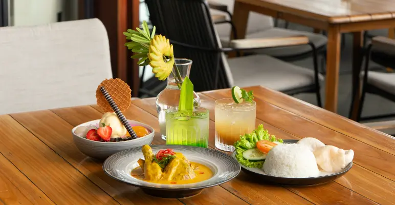Among the highlights, the Beef Wellington (IDR 290,000++) stands out as a sophisticated centrepiece — tender prime beef tenderloin enveloped in mushroom duxelles and golden puff pastry, served with mashed potatoes, beef jus, and seasonal vegetables. For those who crave the warmth of home-style comfort, the Ayam Lodho (IDR 89,000++) offers a taste of East Java’s signature grilled chicken, slowly braised in rich coconut milk and aromatic spices, paired with pandan-scented coconut rice, urap vegetables, and roasted shrimp paste sambal.