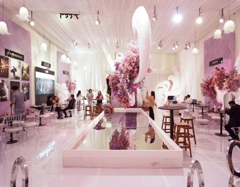 The creative lineup also includes Lily Sasongko Couture & Bridal, Wong Hang Tailor, Flos Decor, Sparkle Orchestra, and Cherry Jessica, who contribute to the overall artistic direction through couture fashion, decorative elements, live music, and refined makeup artistry. The exhibition journey begins with an immersive entrance created by Lasika, Nuansa, and D’factory, featuring animated LED visuals and interactive flooring. Visitors are then guided through several themed islands, each representing a phase of love. Sacred Roots presents the foundation of love with botanical installations and soft yellow tones. Emerging Path shows love taking shape through sculptural forms and dark burgundy florals. Carved in Time reflects commitment with classical statues and flowing blue fabrics. Art of Desire expresses passion with glamorous chandeliers and rich red maroon drapery. Whimsical Realm offers a dreamlike atmosphere with soft pink florals and playful art. LX Area provides an interactive LED and mirrored space where guests can change visuals themselves. Boundless Form represents love without limits through modern lilac and white sculptures. The journey ends with Blossom Eternal, inspired by Chinese tradition with modern design, symbolizing renewal and harmony.