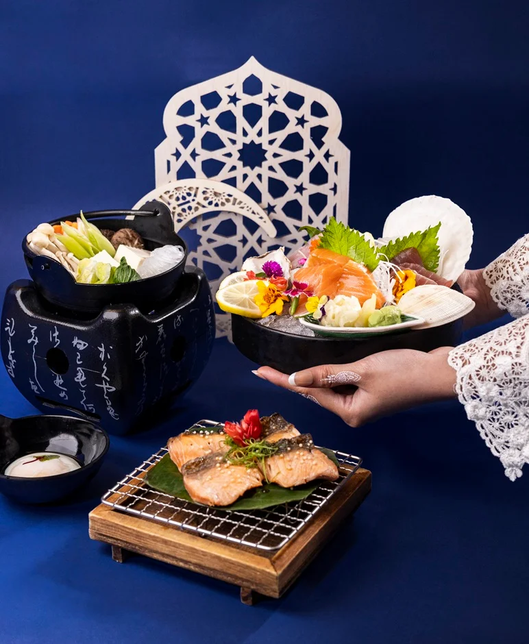 Warmth and nourishment take center stage at the Robatayaki Grill, where wagyu beef skewers and Australian ribeye are slowly grilled over open fire, offering aromatic comfort well-suited for the main course during iftar.