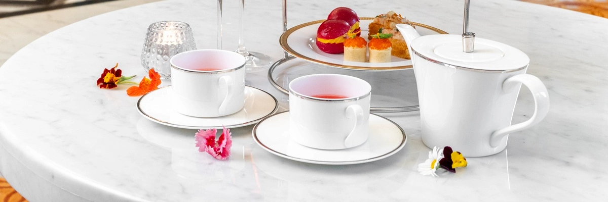 The Scarlet Bloom Afternoon Tea features a tiered set of curated sweet and savory selections developed to reflect the fragrance’s key notes of jasmine sambac, vivid rose petals, and silky ambrette. The set includes a variety of pastries, choux, tarts, and complemented by other delicacies crafted with a light and refined flavor profile. Each set is designed to pair with the included beverage options, offering a harmonious and memorable afternoon tea experience.