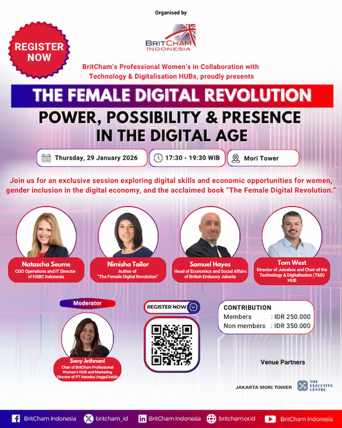 Mark your calendar for an afternoon with Nimisha Tailor, Author of “The Female Digital Revolution”, Tom West, Director of Juicebox Indonesia, Natascha Seume, COO Operations and IT Director of HSBC Indonesia, and Samuel Hayes, Head of Economics and Social Affairs of British Embassy Jakarta, as they share insights on women empowerment through digital skills and participation in the digital economy.