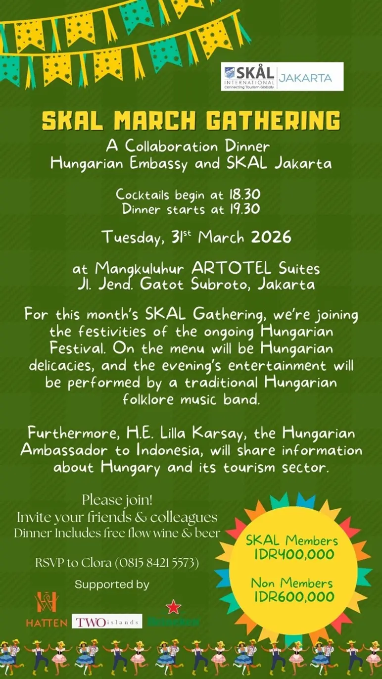 SKAL March Gathering presents a special collaboration dinner with the Hungarian Embassy, celebrating the ongoing Hungarian Festival. The evening features authentic Hungarian delicacies accompanied by live entertainment from a traditional Hungarian folklore music band.