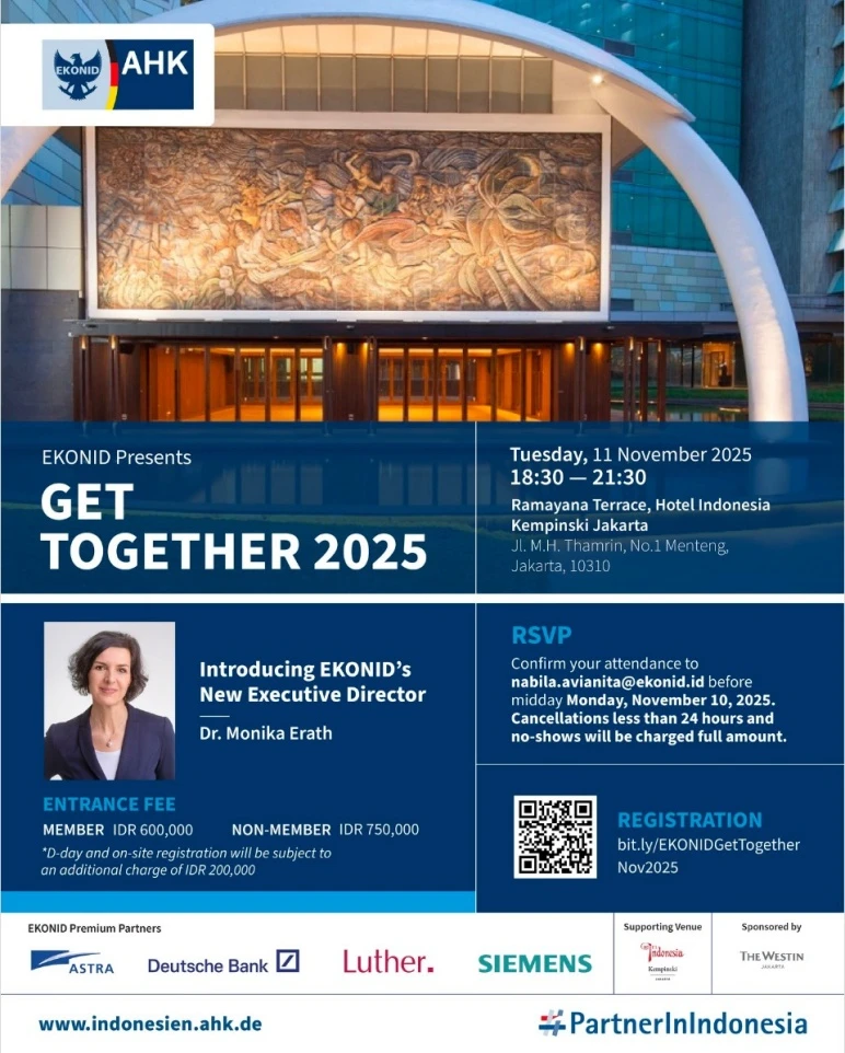 This gathering offers a valuable opportunity to connect with fellow members of the Indonesian-German business community. It will also mark a special moment with the introduction of our new Executive Director, Dr. Monika Erath.