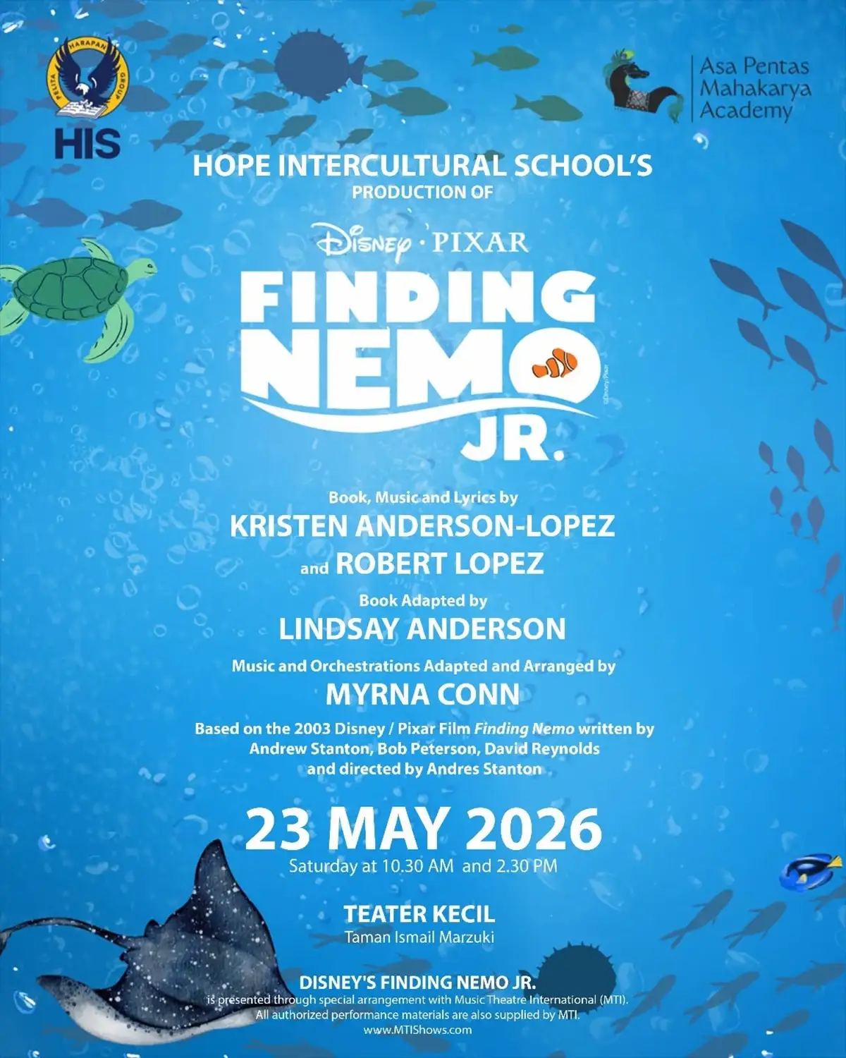 Join us for a spectacular stage production of Finding Nemo Jr., presented by Hope Intercultural School. Adapted from the beloved Finding Nemo by Disney Pixar, this vibrant musical brings the underwater world to life through colorful performances, engaging storytelling, and memorable songs.