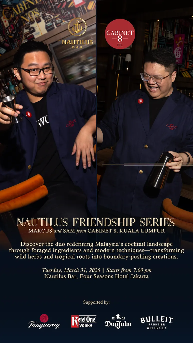 This March, the #NautilusFriendshipSeries sails on. Prepare for a night of flavour driven adventures as @nautilusbarjkt welcome Sam and Marcus from @jwc.cabinet8.kl. Discover the duo redefining Malaysia’s cocktail landscape through foraged ingredients and modern techniques, transforming wild herbs and tropical roots into boundary pushing creations.