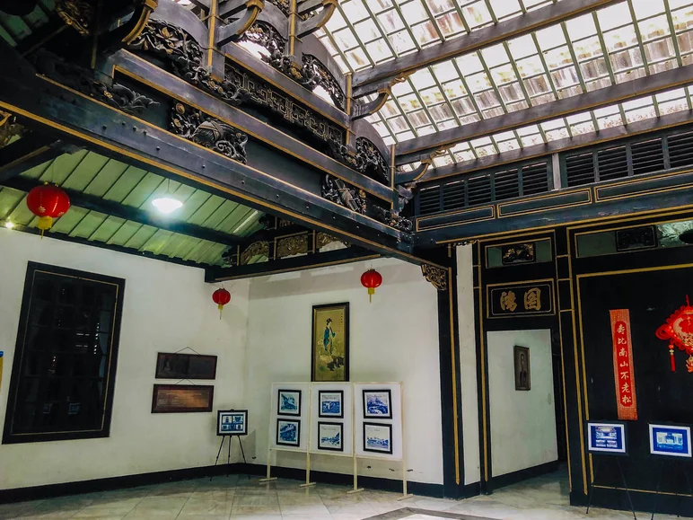 Every detail—from the doors and window frames to the sweeping gabled roof—reflects traditional Chinese craftsmanship, rendered in rich, authentic shades of gold and deep brown. The heart of the house is adorned with portraits of notable Chinese figures connected to the house's legacy displayed alongside historical documents, architectural sketches of Glodok’s Chinese heritage, and calligraphy elegantly inked on pristine paper. Outside, clusters of trees mark each doorway, seamlessly linking the spaces together, while a tranquil garden at the rear, complete with a gentle koi pond.