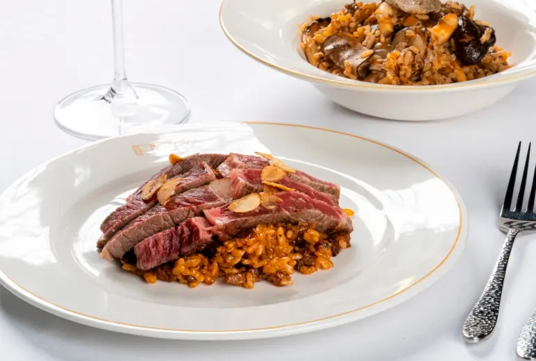 Paella De Erretxuleta A la Parrilla Con Alioli De Tuetano Y Chips De Ajo