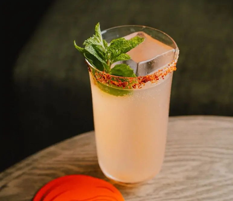Palojito – mint tequila, citrus Paloma base, tonic, topped with a playful chili-lime rim