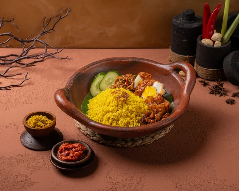 Chef de Cuisine of The Sira, a Luxury Collection Resort and Spa, Lombok, Adi Safardian Mulyana showcases one of Indonesia’s most iconic dishes – Ayam Taliwang. The chicken is marinated in a vivid blend of chili, garlic, shrimp paste, and lime before being grilled until the skin caramelizes into a spicy glaze. In Indonesia, yellow rice has long symbolized prosperity and gratitude. A dish meant for gatherings and for sharing, Chef Adi’s rendition of Nasi Kuning – turmeric-infused rice glowing with a warm golden hue – is perfumed with lemongrass and coconut milk.