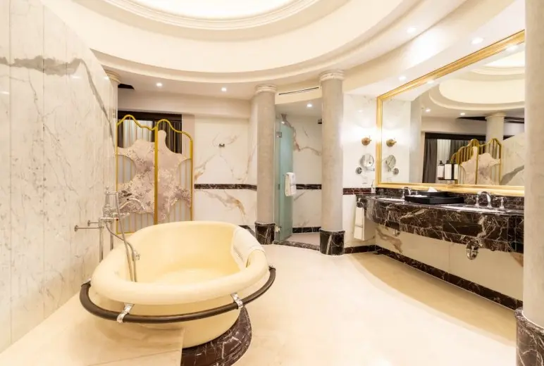 Spanning 220 square metres, the Casablanca Suite offers two bedrooms; two bathrooms including an ensuite; an expansive living room; a generous dining area; and a fully equipped kitchen complete with fridge, dishwasher, rangehood, oven, and stone benchtops. Modern conveniences include a 76-inch smart TV, complimentary Wi-Fi, and a dedicated workspace for business travellers. The suite also features a private entrance, allowing housekeepers to perform cleaning duties or deliver room service with discretion and ease.