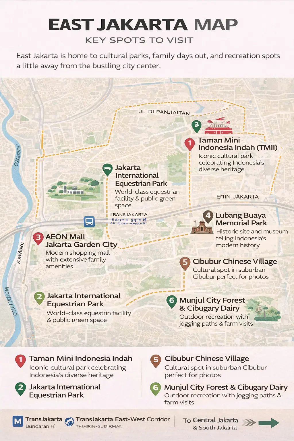 East Jakarta (Jakarta Timur) is the largest administrative area in DKI Jakarta, known for its cultural attractions, family-friendly destinations, and quieter, residential feel compared with the city’s more central and bustling districts.