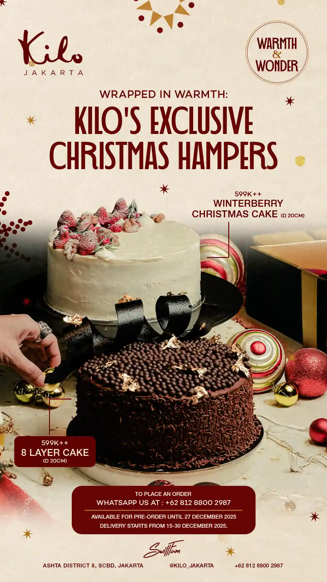 Wrapped in warmth and wonder, Kilo Jakarta presents its Exclusive Christmas Hampers, thoughtfully crafted to bring festive indulgence to the season. The collection features two decadent cake options, each sized at 20 cm: the indulgent 8 Layer Cake and the elegant Winterberry Christmas Cake, both priced at IDR 599K++. Available for pre-order until 27 December 2025, with delivery running from 15–30 December 2025
