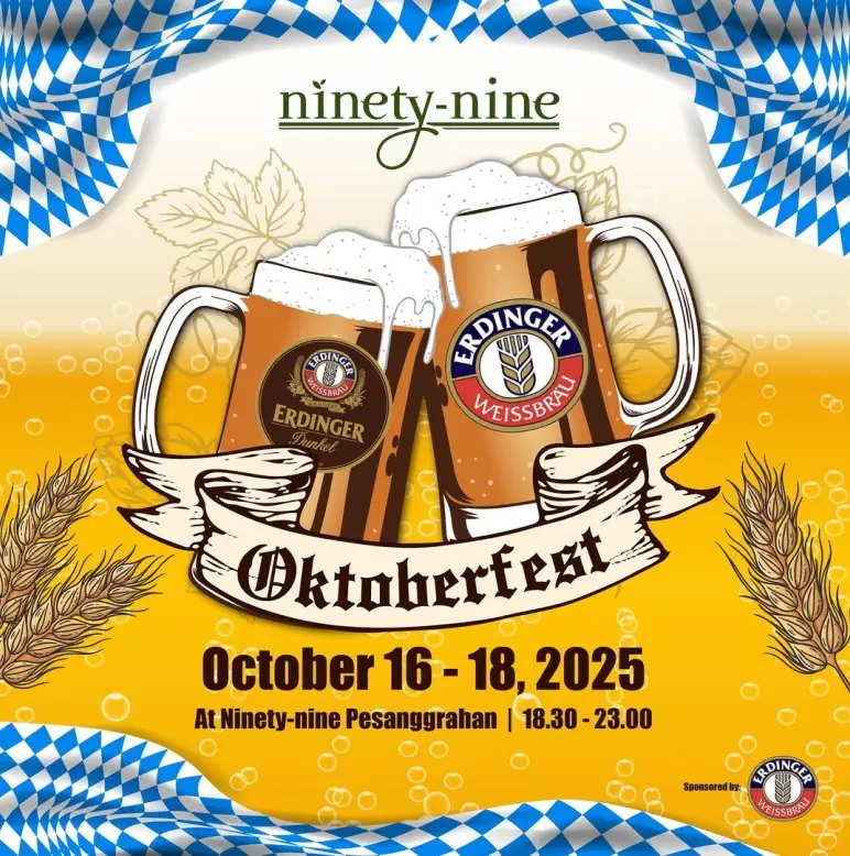 Mark your calendar for the return of Ninety Nine Oktoberfest! The most awaited Bavarian celebration is back at Ninety Nine Jakarta, bringing you an unforgettable experience filled with live music, exciting games, free-flow Erdinger beer, authentic German food, and a signature Oktoberfest mug souvenir to take home. Join the festivities from 16 – 18 October 2025, 6:30 PM to 11:00 PM, with tickets priced at IDR 599K++ for early birds (available until 6 October 2025) and IDR 699K++ for normal price. Don’t miss out on the cheer—book now via WhatsApp at 0811 888 1622.