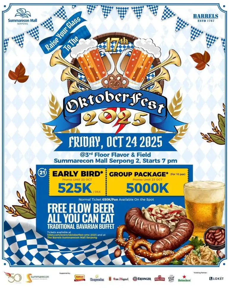 Oktoberfest is back for its 17th year at Summarecon Mall Serpong! Mark your calendar for Friday, 24 October 2025 at the 3rd Floor, Flavor & Field SMS 2, starting at 7 PM, and get ready for an unforgettable night with free-flow beer, an all-you-can-eat Bavarian buffet, and endless festive cheer. Tickets are now on sale with Early Bird tickets at IDR 525K/pax (limited availability) and a Group Package at IDR 5,000K for 10 pax. Don’t miss out—grab your tickets now via here or at The Barrels, Summarecon Mall Serpong.
