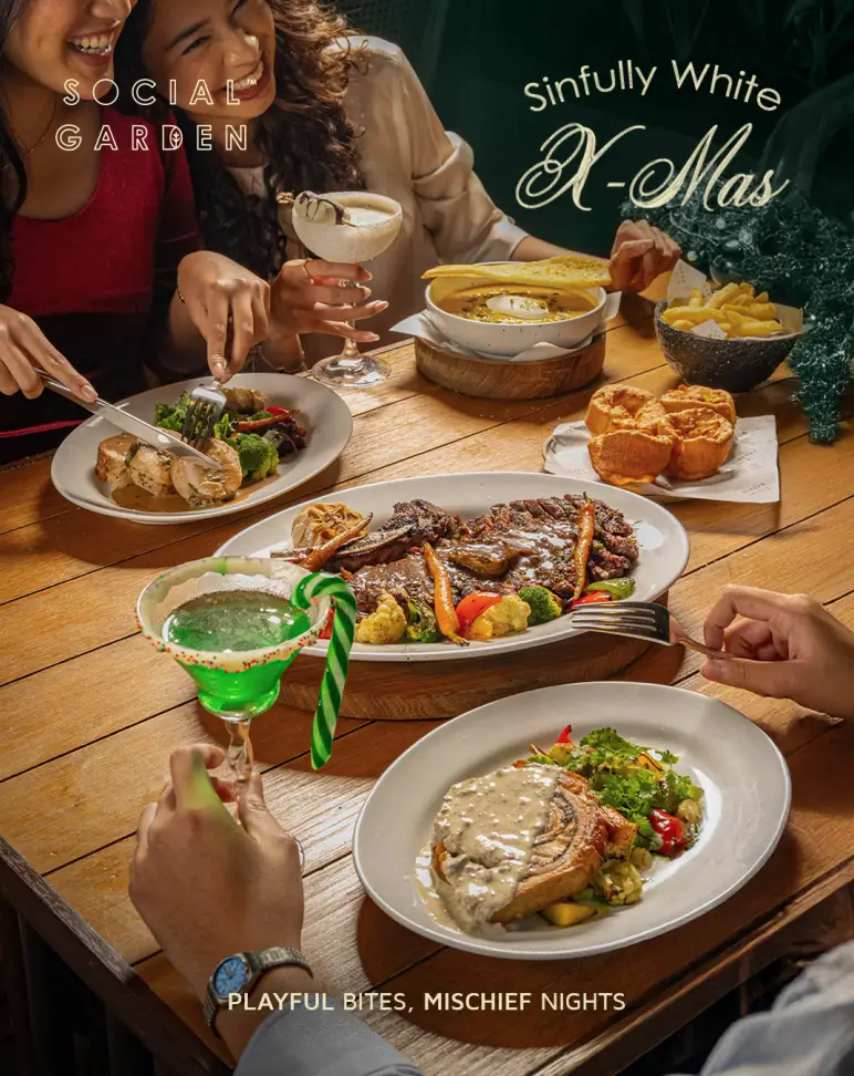 Social Garden welcomes the Sinfully White Xmas with a festive touch that transforms the space into a warm holiday escape. Lush greens, soft gold accents, and gentle details come together to create an atmosphere filled with seasonal charm and elegance. Paired with playful bites and mischievous nights, it’s a celebration where festive indulgence meets unforgettable moments.