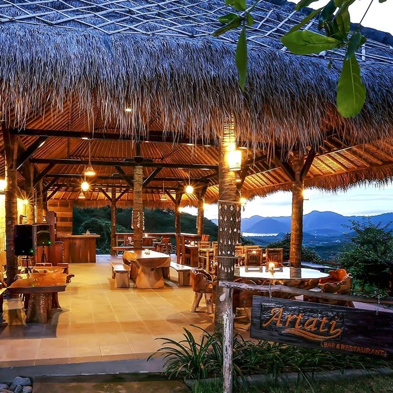 Nestled on a scenic hillside with lush greenery, Artati Lombok Bungalows & Restaurant offers breathtaking views overlooking Kuta Mandalika Beach. Guests can enjoy a meal at the restaurant or unwind with a drink at the lounge. The elevated location provides a stunning perspective of the surroundings, adding to the serene ambiance of this refreshing dining destination.