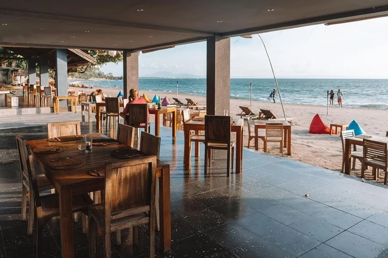 Located right on the beach at Selong Belanak, Laut Biru Bar & Restaurant beautifully integrates with the coastal landscape, using driftwood and ocean hues to create a tranquil dining space. This beachfront gem invites you to enjoy a variety of Western and local dishes in a chic, natural setting with ocean views. Relaxing by the surf with a meal here is a true island delight.