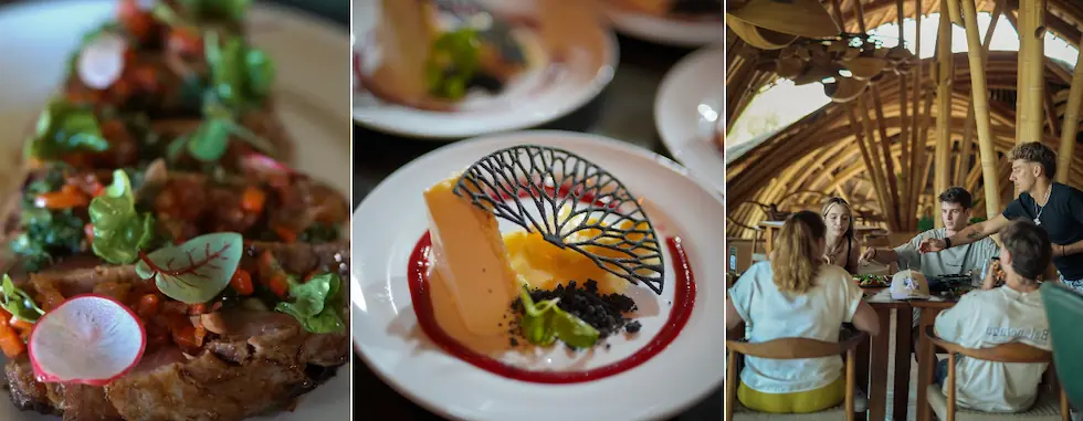 Perched on a hill overlooking the Indian Ocean, Milky Wave offers Japanese fusion cuisine in a beautiful bamboo building. The views stretch across South Lombok’s dramatic hills, creating an unforgettable setting. Guests enjoy sushi, sashimi, steaks, and desserts crafted with fresh local ingredients and Japanese influences. The open kitchen and bar let visitors watch the team in action, and photo lovers will find plenty of moments to capture. This is a family friendly spot made for lingering sunsets and special dinners.