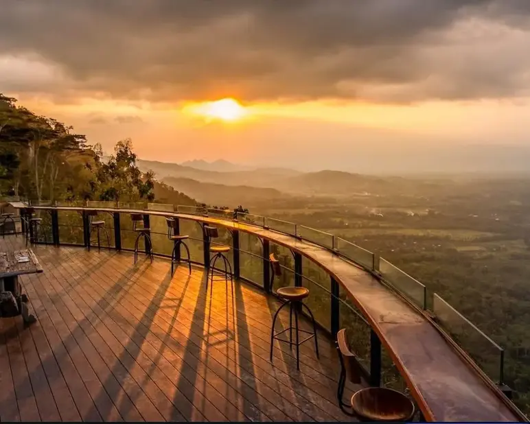 Perched atop the Menoreh Hills, Enam Langit by Plataran offers a spectacular "above the clouds" dining experience with a 360-degree panorama of six majestic volcanoes—Merapi, Merbabu, Telomoyo, Andong, Sumbing, and Prau. Known as one of the most exclusive viewpoints near Borobudur, this rustic-chic destination specializes in elevated Indonesian and international cuisine, making it the ultimate spot for a luxurious picnic breakfast or a romantic sunset dinner overlooking the temple valley below.