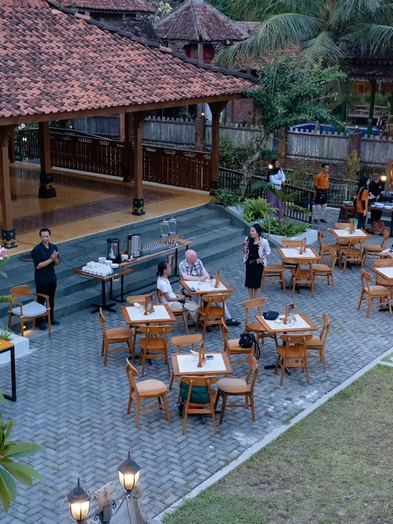 Patio Colonial, located within the prestigious Plataran Borobudur Resort & Spa, offers an elegant dining experience characterized by its grand Dutch-colonial architecture and direct views of the Borobudur Temple and Menoreh Hills. The restaurant provides a sophisticated, "old-world" atmosphere where guests can enjoy refined Indonesian and international dishes while overlooking the temple's iconic stupas peeking through the lush teak forest. Its combination of historical charm and serene garden vistas makes it a premier choice for those seeking a quiet, upscale retreat just a stone's throw from the monument.