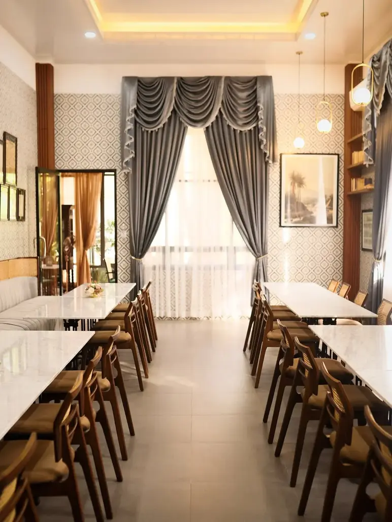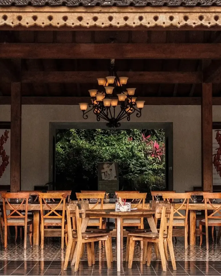 Van Bloemen 1881 transports diners back to the 19th century with its elegant Dutch-colonial architecture and nostalgic, vintage-inspired interiors. Located just 3 km from the temple in Kembanglimus, this restaurant and resort offers a unique European "royal" ambiance, featuring grand ballrooms and a cozy library filled with historical charm. Outside, the property opens up to a tranquil garden and a scenic terrace where guests can enjoy a fusion of authentic Indonesian heritage dishes and Dutch classics like Poffertjes and Bitterballen, all while taking in the serene view of the surrounding hills and lush greenery that defines the Borobudur countryside.