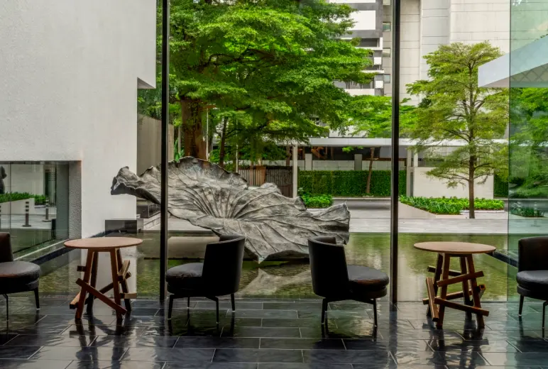 Navone’s signature lies in her ability to create a modern sense of place without resorting to cultural imitation. Through a thoughtful blend of local materials such as wood, ceramic, and stone, she introduces playful yet refined touches — from oversized woven seat-backs to subtle infusions of Buddhist orange. The interiors celebrate texture and light: marble surfaces, textured stone, and bamboo screens interact to form an environment that is both luxurious and quietly meditative. The lobby counter, inspired by Thai masonry and temple reliefs, exemplifies this dialogue between heritage and contemporary design.