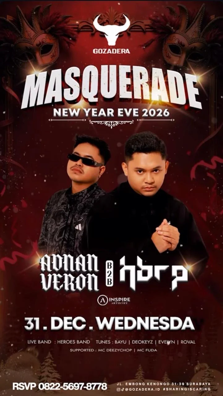 Gozadera invites partygoers to step into mystery and excitement with its Masquerade New Year Eve 2026. Featuring Avnan Veron and B2B HBRP, the event promises a high-energy night supported by Heroes Band and a lineup of DJs including Bayu, Deokeyz, Evelyn, and Roval. With a dramatic masquerade concept and a lively crowd atmosphere, this celebration at Embong Kenongo is designed for those who enjoy bold performances and immersive nightlife experiences.