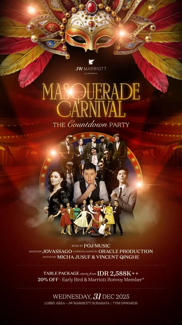 JW Marriott Surabaya invites guests to step into a world of mystery and elegance with “Masquerade Carnival: The Countdown Party.” Set in the Lobby Area and starting from 7 PM onwards, this grand celebration offers a luxurious carnival atmosphere. The night features lively entertainment with music by POJ Music, a magical performance by Jovassago, and vibrant carnival dances by Oracle Production, hosted by Micha Jusuf and Vincent Qinghe. Table packages start from IDR 2,588,000++, with a 20% early bird discount for Marriott Bonvoy members.