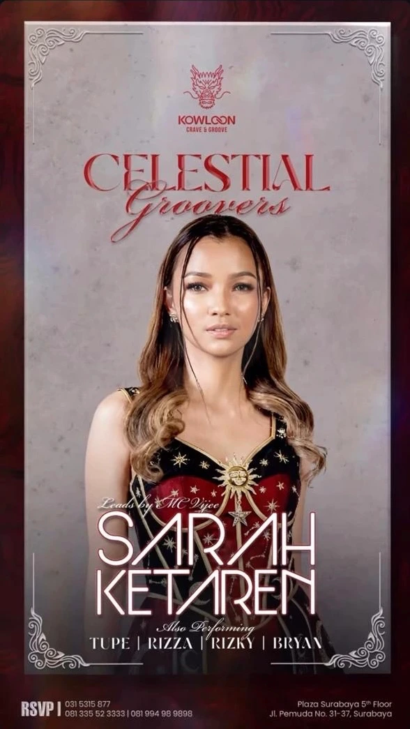 Kowloon Cave & Groove presents Celestial Groovers, a sophisticated New Year’s Eve celebration led by MC Wijee, with a live performance by Sarah Keta Reni. The night is elevated by additional performances from Tupe, Rizza, Rizky, and Bryan, creating a refined yet energetic atmosphere. Located on the 5th floor of Plaza Surabaya, this event blends modern groove with elegant visuals for a stylish city countdown.