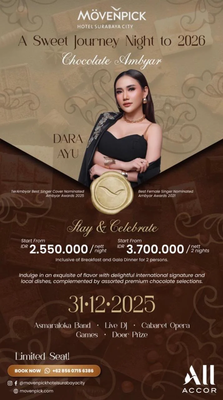 Mövenpick Hotel Surabaya City presents “A Sweet Journey Night to 2026: Chocolate Ambyar.” This New Year’s Eve celebration combines music, culinary delights, and a cozy festive atmosphere. Highlights include a special performance by Dara Ayu, supported by Asmaraloka Band, a Live DJ, and a Cabaret Opera show, along with games and door prizes. Stay packages start from IDR 2,550,000 nett per night and IDR 3,700,000 nett for two nights, inclusive of breakfast and a gala dinner for two, featuring premium chocolate selections.