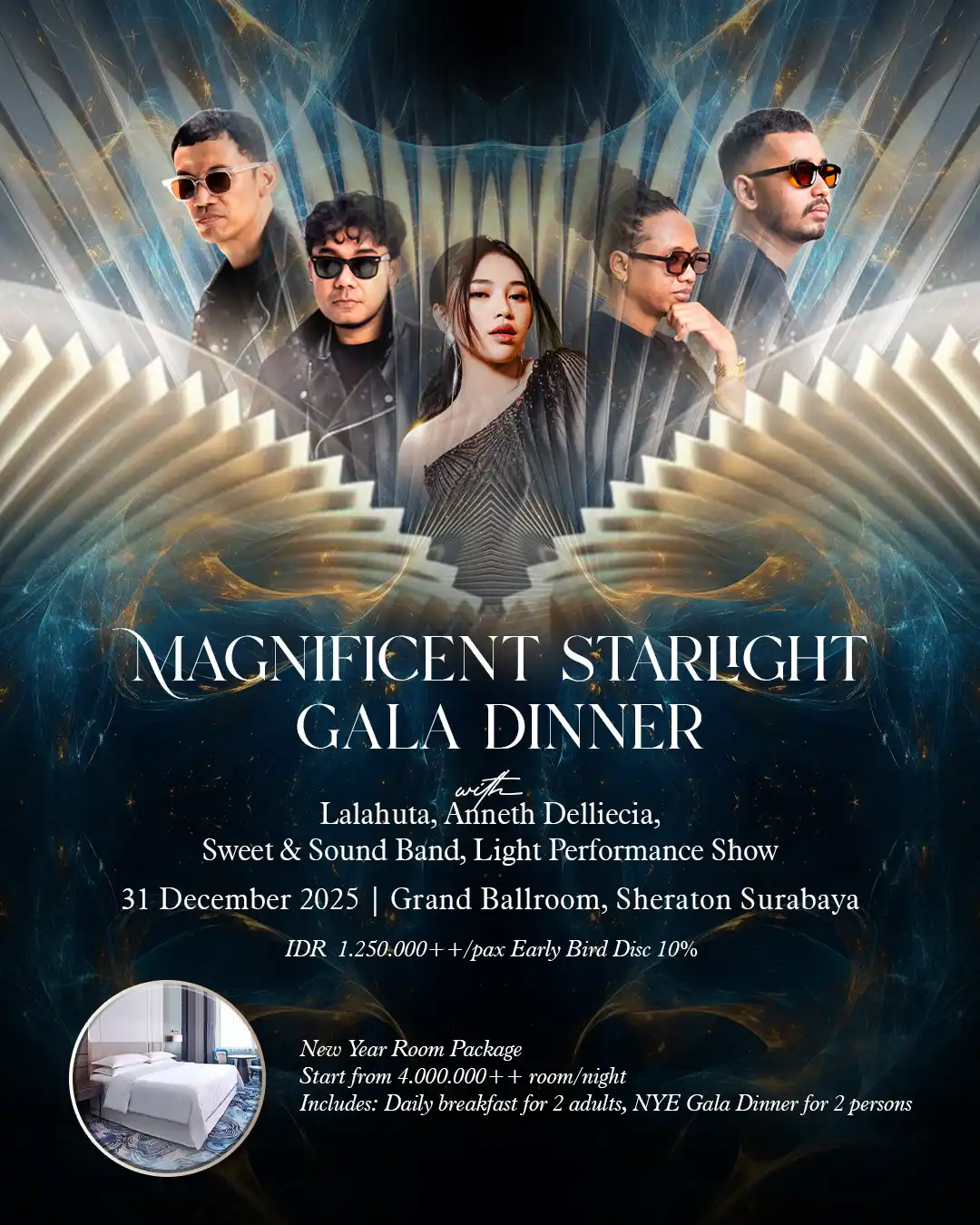 Sheraton Surabaya presents Magnificent Starlight Gala Dinner, an elegant New Year’s Eve celebration held at the Grand Ballroom on 31 December 2025. The night features performances by Lalahuta, Anneth Dellicia, Sweet & Sound Band, and a spectacular Light Performance Show, creating a glamorous and festive countdown atmosphere. The gala dinner is priced from IDR 1,250,000++ per person, with a 10% early bird discount. Sheraton also offers a New Year Room Package starting from IDR 4,000,000++ per room per night, including daily breakfast for two adults and a New Year’s Eve gala dinner for two persons.