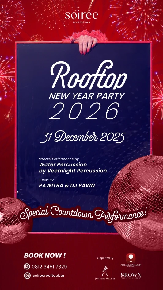 Soirée hosts a festive “Rooftop New Year Party 2026” on 31 December 2025, offering a dynamic celebration filled with visual and musical highlights. The night includes a special water percussion performance by Velmore Percussion, music by Pawitra & DJ Gatra, and a memorable countdown moment. With its bold production and celebratory energy, Soirée creates a lively environment perfect for welcoming 2026 in a spectacular way.