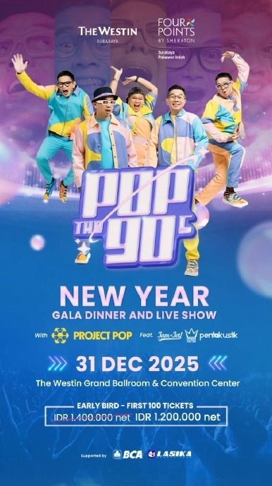 The Westin Surabaya, together with Four Points by Sheraton Surabaya Pakuwon Indah, presents Pop the 90s, a New Year’s Eve Gala Dinner and Live Show at The Westin Grand Ballroom & Convention Center. Headlined by legendary Indonesian group Project Pop, and supported by Jam or Jet and Pentakustik, this event combines nostalgia, humor, and high-energy performances. With a festive dinner and glamorous ballroom setting, Pop the 90s stands out as one of Surabaya’s most iconic New Year celebrations.