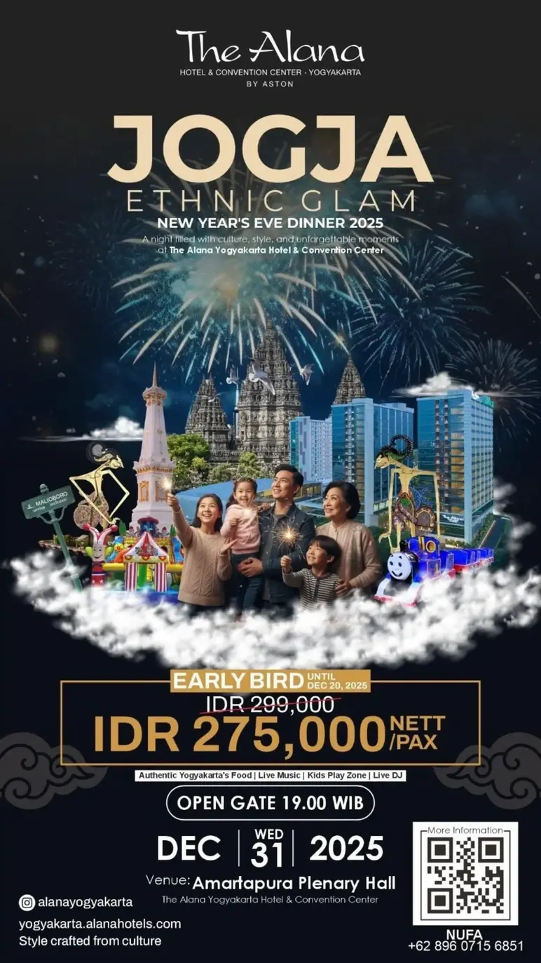 Guests can also enjoy the "Jogja Ethnic Glam" dinner package for IDR 299,000 net per person (IDR 275,000 for Early Bird). The dinner will be held on December 31, 2025, at the Amartapura Plenary Hall, starting at 7 p.m.