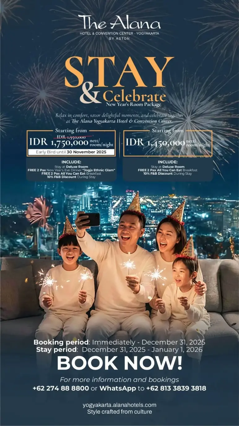 New Year's celebrations at The Alana Yogyakarta are no less exciting. A stay package is offered at IDR 1,950,000 nett per room per night (IDR 1,750,000 for Early Bird bookings) for bookings before November 30, 2025. This package consists of 1 night stay in a Deluxe Room, 2 free New Year's Eve Dinner packages "Jogja Ethnic Glam," 2 free All You Can Eat breakfast packages, and a 10% discount on F&B during the stay. This package can be booked until December 31, 2025, with a stay period on December 31, 2025.