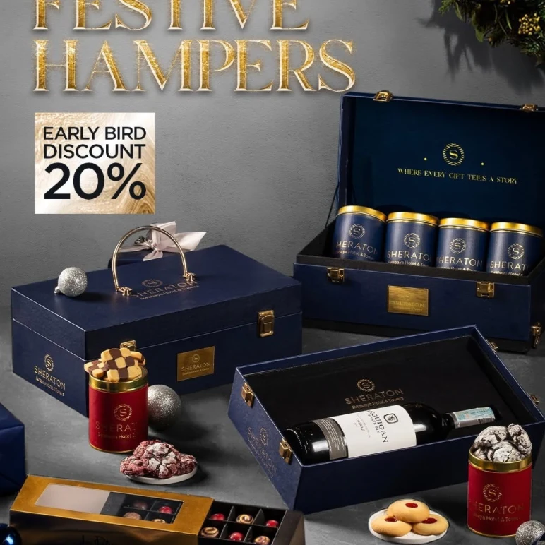 Sheraton’s “Unwrap the Season of Giving” collection features two premium festive hampers. Starlight Sweet includes four selections of cookies and a macaron set, while Midnight Sip offers a bottle of wine, cookies, and pralines. Crafted for meaningful giving, both sets come with an early-bird 20% discount until 10 December.