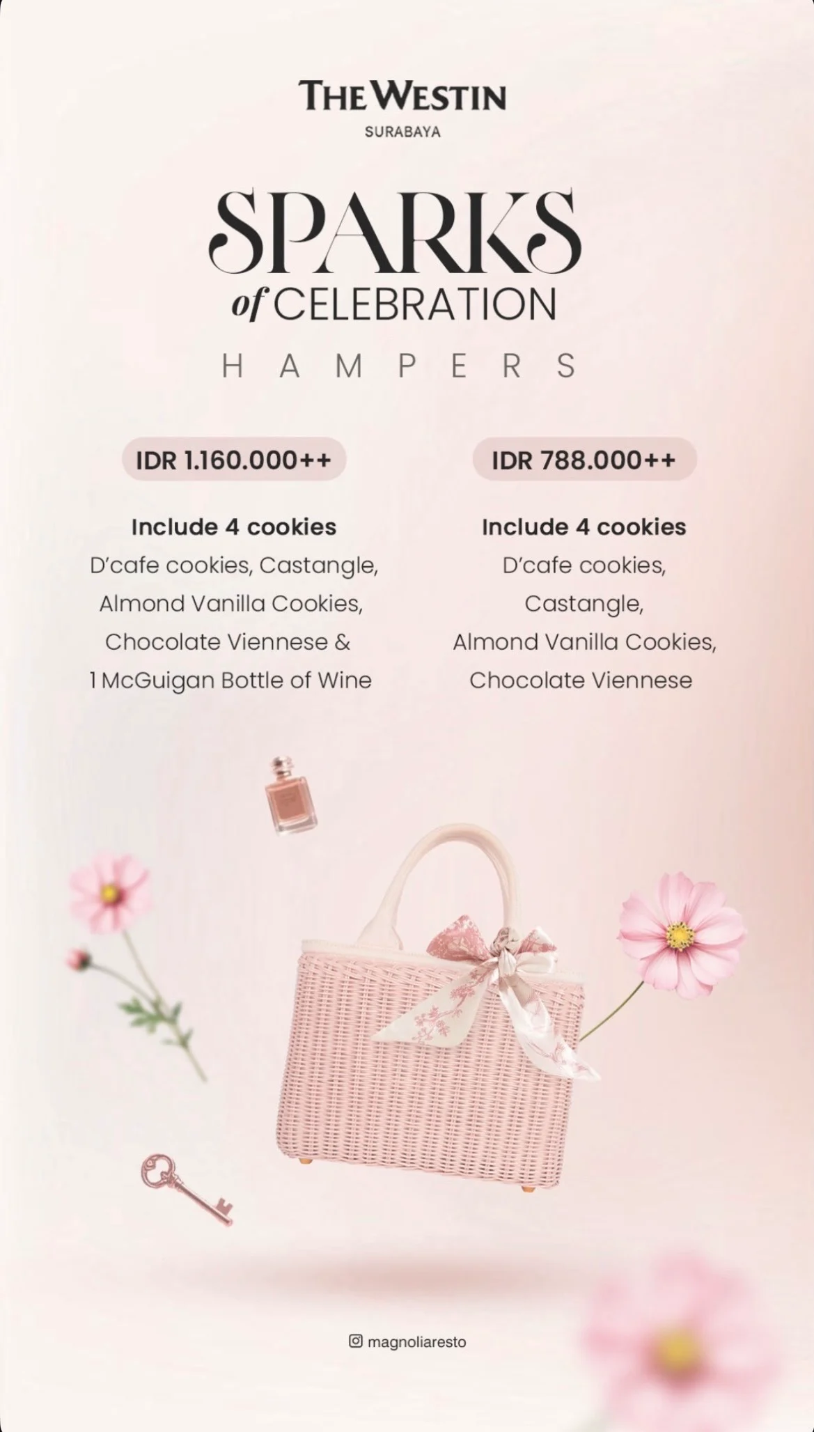 The Westin Surabaya introduces Sparks of Celebration Hampers, a refined collection designed for meaningful gifting. Both hampers are presented in a lovely pastel-pink rattan bag decorated with a floral ribbon, creating a soft and elegant holiday aesthetic. The first hamper, priced at IDR 1,160,000++, includes four premium cookies, D’cafe Cookies, Castangle, Almond Vanilla Cookies, and Chocolate Viennese, along with one bottle of McGuigan wine, making it an ideal option for special celebrations or premium corporate gifts. A second option, priced at IDR 788,000++, offers the same assortment of cookies without the wine, providing a more accessible yet equally thoughtful festive gift.