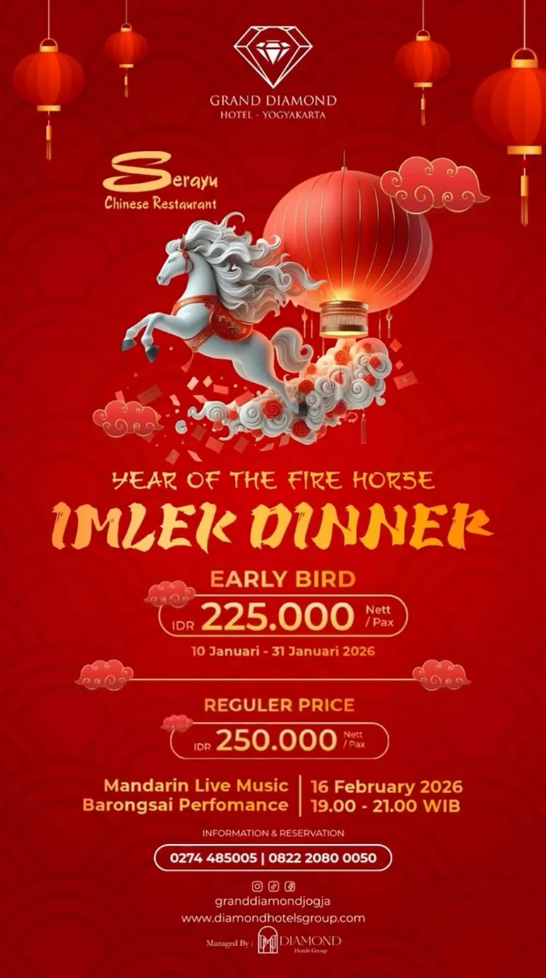 Grand Diamond presents a Chinese New Year dinner at Serayu Chinese Restaurant for IDR 250,000 nett/pax on February 16, 2026, starting from 7 to 9 pm. For guests who book Early Bird until January 31, 2026, can get a price of IDR 225,000 nett/pax. Guests can enjoy dinner with family with live Mandarin music and a lion dance performance.