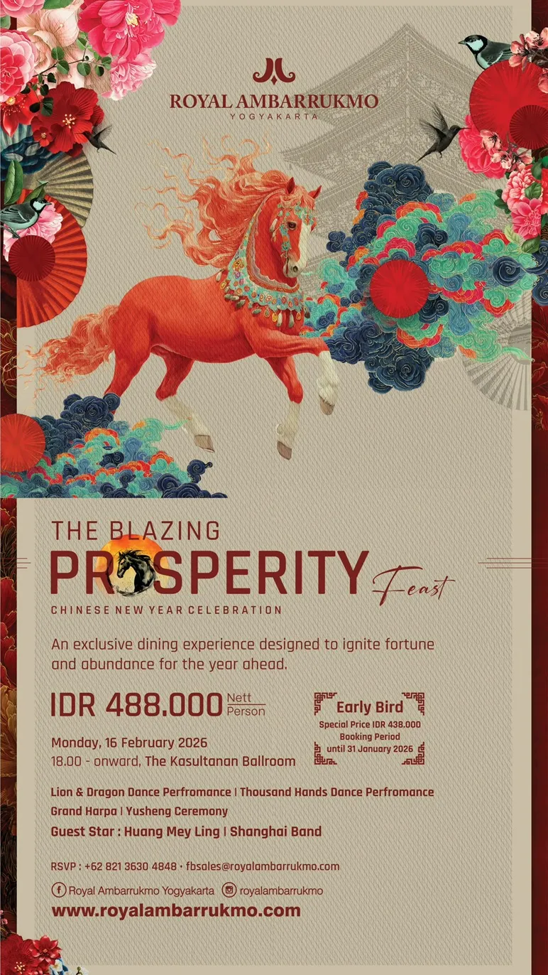 Royal Ambarrukmo presents a Chinese New Year dining experience through The Blazing Prosperity Feast held at The Kasultanan Ballroom at a price of IDR 488,000 nett/person, on February 16, 2026, starting from 6 pm until finished. For Early Bird reservations until January 31, 2026, guests will get a price of IDR 438,000. Guests will be entertained with a lion & dragon dance performance, a thousand hands dance performance, a grand harp, a yusheng ceremony, with a special performance from Huang Mey Ling, Shanghai Band.